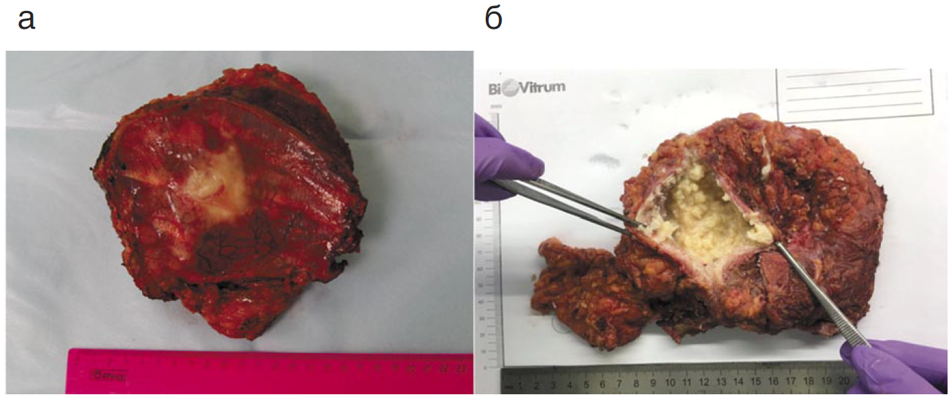 Рис. 7: а – фрагмент передней грудной стенки слева с участками III–V ребер; б – разрастание опухолевой ткани в мягких тканях передней грудной стенки.