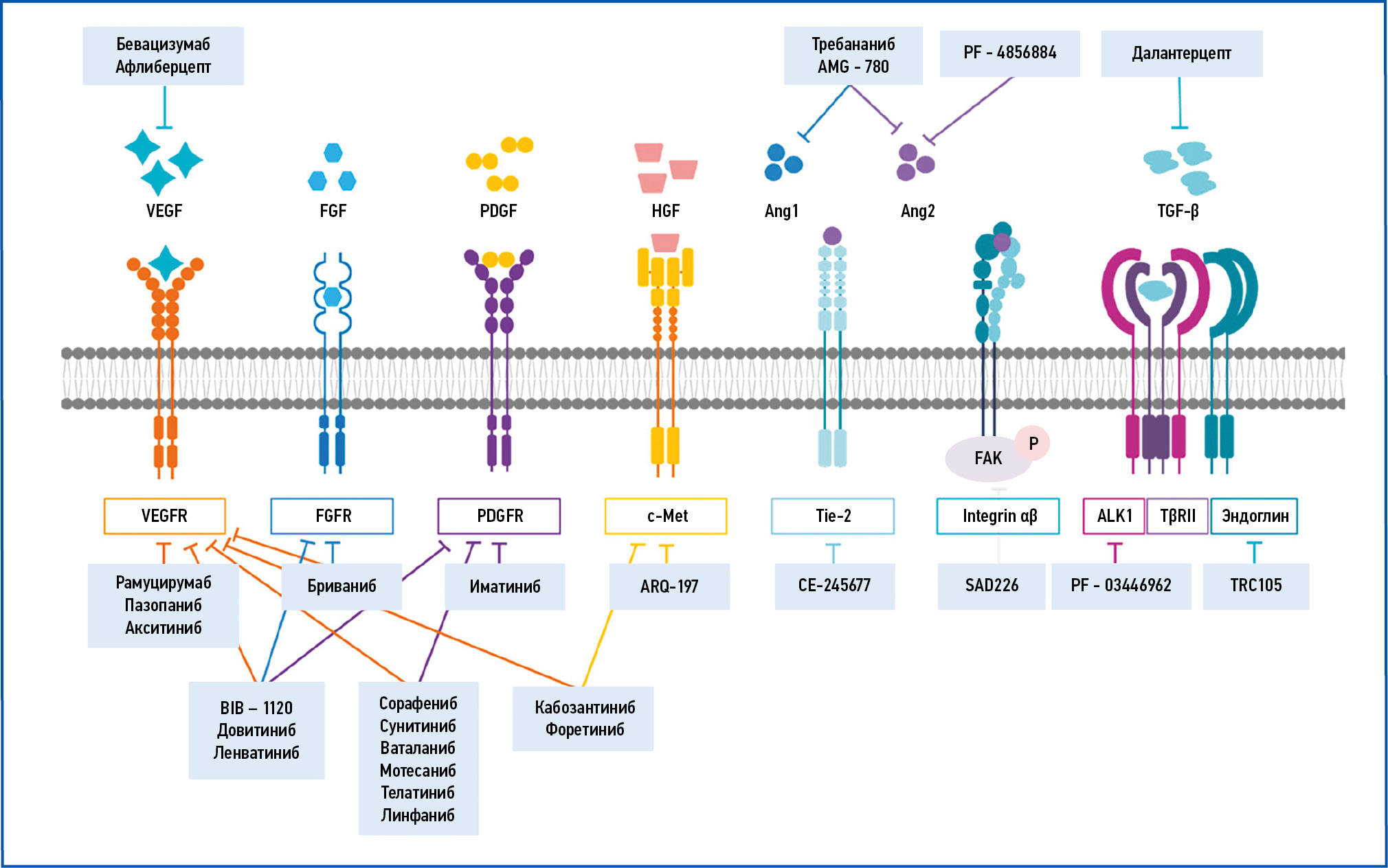 Опухолевый ангиогенез определяется дисбалансом между проангиогенным и антиангиогенным сигналингом в микроокружении опухоли, при этом ключевым проангиогенным медиатором является сосудистый эндотелиальный ростовой фактор (VEGF), а другими стимулирующими факторами могут служить фактор роста фибробластов (FGF)-2, тромбоцитарный ростовой фактор (PDGF), фактор роста гепатоцитов (HGF), и в том числе медиаторы воспаления, такие как интерлейкины и простагландины [15]. VEGFs (в первую очередь VEGF-A) являются наиболее важными проангиогенными стимуляторами, активируют клеточный сигнал путем связывания с VEGF-рецептором (VEGFR), вызывая пролиферацию и выживание клеток эндотелия и повышая сосудистую проницаемость [16]. Первым гуманизированным моноклональным антителом в отношении всех циркулирующих форм VEGF-A являлся бевацизумаб, блокирующий его связывание с VEGFR. Будучи зарегистрированным в 2004 г. для лечения метастатического колоректального рака, в настоящее время используется и при других нозологиях [16, 17]. В дальнейшем помимо бевацизумаба появились новые лекарственные препараты – ингибиторы связывания VEGF с рецептором (афлиберцепт) и антитела/ингибиторы, блокирующие передачу сигнала через VEGFR (рамуцирумаб, пазопаниб, акситиниб); рис. 1 [17, 18].