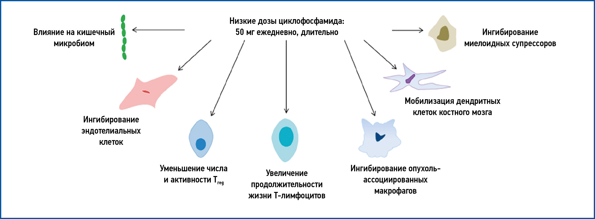 В качестве примера можно привести циклофосфамид с вариантами реализации цитотоксического, антиангиогенного и иммуномодулирующего действия (см. рис. 2) при использовании низких доз в пролонгированном режиме [38]. Несмотря на то, что циклофосфамид стал первым химиотерапевтическим агентом, у которого зарегистрирован выраженный иммуномодулирующий потенциал, точный механизм до сегодняшнего дня остается не до конца ясен [38].