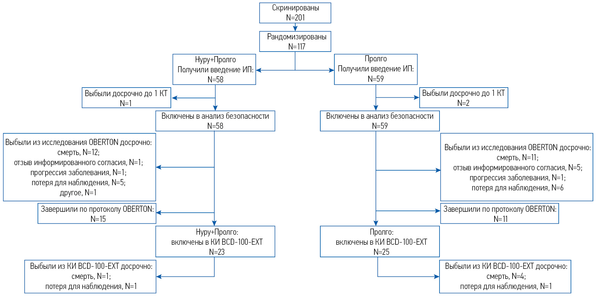 В группу нурулимаб+пролголимаб (КИТ нурулимаб+пролголимаб с переходом на монотерапию препаратом пролголимаб) включены 58 пациентов, в группу монотерапии пролголимабом – 59 пациентов (рис. 1). На блок-схеме представлены только категории, имеющиеся или отсутствующие у субъектов обеих групп.