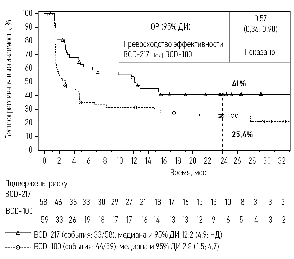 Вторичные конечные точки включали ОВ, частоту объективного ответа (ЧОО), частоту достижения контроля над заболеванием (ЧКЗ), время достижения ответа на терапию и длительность ответа на терапию.