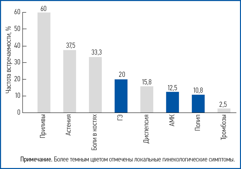 Результаты частотного распределения и структура НЛР, возникающих при приеме ТАМ, представлены на рис. 1. В структуре НЛР на прием ТАМ присутствуют как системные, так и локальные НЛР, причем системные доминируют над локальными с наибольшей представленностью приливов как вазоактивных симптомов со стороны вегетативной нервной системы (60%). Локальные гинекологические симптомы представлены ГЭ, ПЭ и АМК, которые в данной выборке встречаются значительно реже (20; 10,8 и 12,5% соответственно), однако в сумме составляют 43,3%, что с учетом низко выраженной субъективной оценки (частое асимптомное течение, отсутствие жалоб) требует пристального внимания со стороны акушеров-гинекологов. Полученный нами высокий процент локальных гинекологических симптомов оказался близок данным P. Neven и соавт., указывающих на 50% каких-либо неблагоприятных эффектов в отношении эндометрия у женщин, принимавших ТАМ [5].