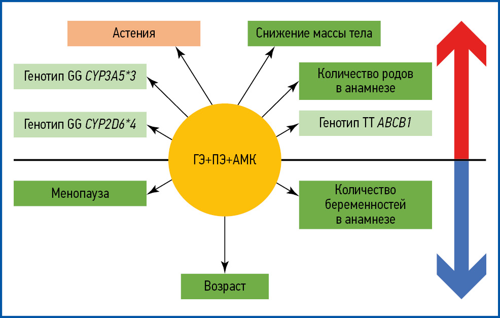Исходя из значений регрессионных коэффициентов, такие факторы, как снижение массы тела, наличие астении, увеличение количества родов, наличие генотипа ТТ полиморфного варианта ABCB1 3435, наличие генотипа GG полиморфного варианта CYP2D6*4, GG полиморфного варианта CYP3A5*3, имеют прямую связь с вероятностью развития комбинированной конечной точки локальных гинекологических симптомов (ГЭ+ПЭ+АМК). В то же время наличие менопаузы, увеличение количества беременностей в анамнезе и увеличение возраста женщины уменьшают вероятность развития комбинированной конечной точки (ГЭ+ПЭ+АМК), так как имеют обратную связь (рис. 2). Факторы, расположенные слева от красной стрелки (направленной вверх), отражают прямую связь с клинико-анамнестическими и генетическими детерминантами, тем самым способствуя росту риска комбинированной конечной точки, а факторы, расположенные слева от синей стрелки (направленной вниз), – обратную связь, указывая на снижение риска возникновения комбинации локальных гинекологических симптомов. Следует отметить, что под увеличением количества родов и беременностей в данной модели подразумевается количественный параметр ≥1, выраженный в абсолютных числах (1, 2, 3, 4 и более), а остальные параметры представлены в виде качественных переменных (0 – есть или 1 – нет).