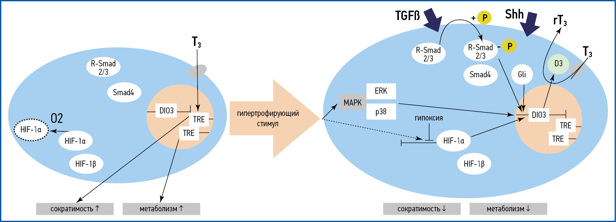 В нормальном КМ Т3 поглощается специфическими транспортерами, и гены, которые транскрипционно регулируются Т3, характеризуются присутствием в их промоторах элементов ответа на гормоны щитовидной железы (TRE), с которыми связывается рецептор Т3. HIF-1α разрушается в условиях нормальной концентрации кислорода, тогда как HIF-1β стабилен. В гипертрофированном КМ несколько сигнальных путей сходятся на пути MAPK, из которых ERK (extracellular signal-regulated kinase) и киназа p38 активируют транскрипцию гена DIO3. Ишемия и/или гипертрофия КМ приводит к повышению уровня HIF-1α, который в комплексе с HIF-1β и составляет HIF-1. Трансформирующий фактор роста β (TGFβ) стимулирует сигнальный путь Smad путем фосфорилирования R-Smad2 и 3, которые образуют комплекс со Smad4. Вместе с HIF-1 фосфорилированным ERK и p38 это приводит к стимуляции транскрипции гена DIO3. Экспрессия фермента D3 дополнительно стимулируется Sonic hedgehog (Shh), который подает сигналы через семейство транскрипционных факторов Gli. D3 превращает Т3 в rТ3, что приводит к снижению экспрессии Т3-зависимых генов и сопутствующему снижению сократительной активности и метаболизма клеток [29].
