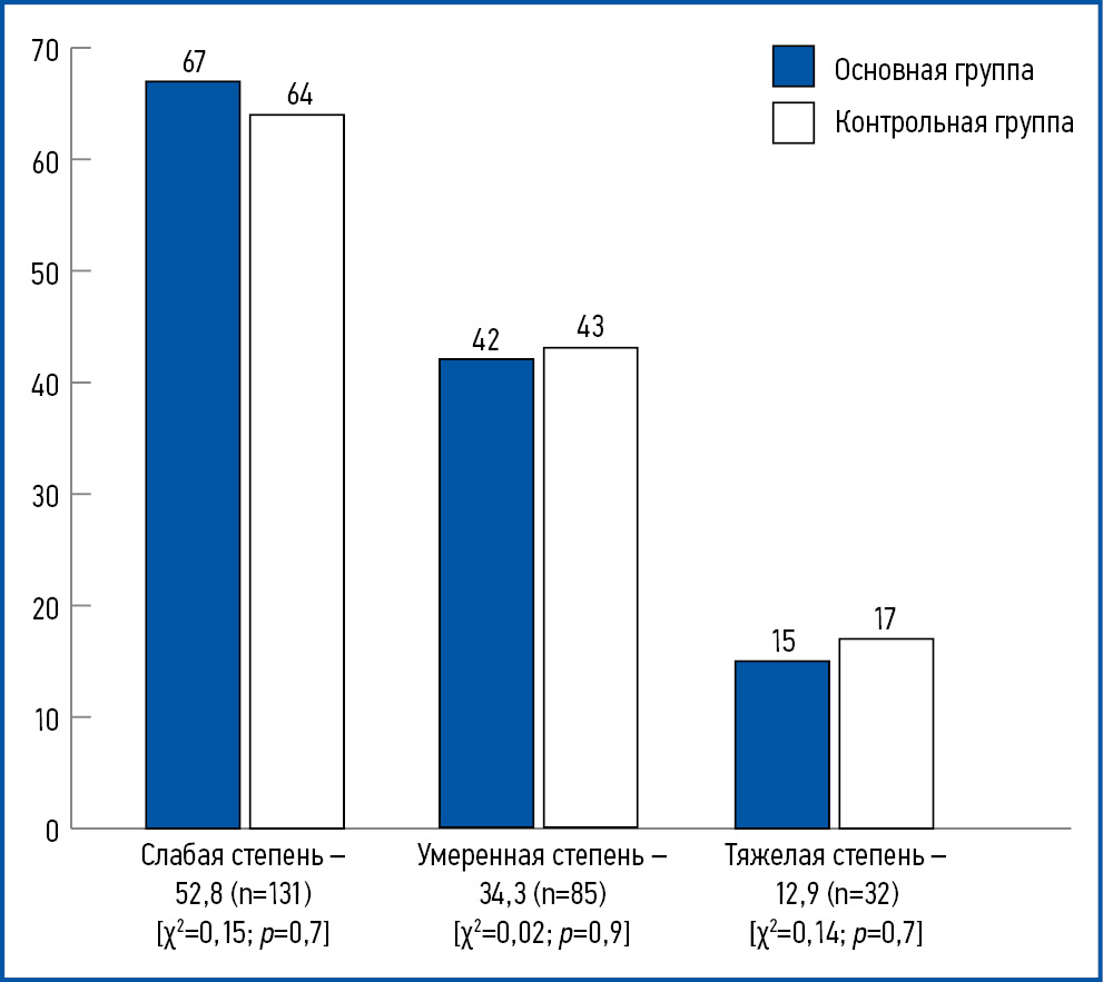 Распределение пациентов в изучаемых группах по степени анемии представлено на рис. 1. При этом анемию слабой степени определяли как снижение гемоглобина крови до 100–119 г/л, умеренной степени – до 80–99 г/л, тяжелую – ниже 80 г/л.