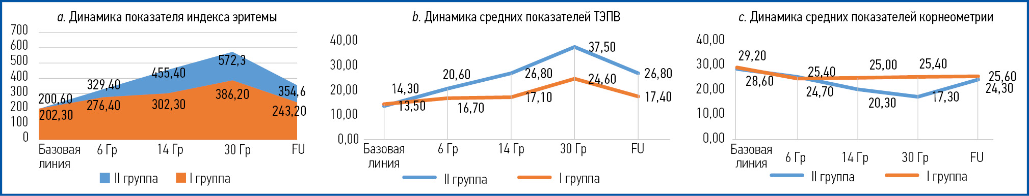 Полученные результаты продемонстрировали значимое снижение показателей физиологических параметров кожи, таких как эритема, пигментация, ТЭПВ, у пациентов, включенных в опытную группу, по сравнению с группой контроля. У пациентов I группы отмечались менее выраженные снижение степени увлажненности кожных покровов и признаки ранней дозозависимой эндотелий-зависимой микрососудистой дисфункции. В нашем дизайне исследования измеряемые изменения кожи, вызванные воздействием ионизирующего излучения, собирались с интервалом при достижении СОД 6, 14 и 30 Гр, а также спустя 14 дней после окончания курса ЛТ. В целом тяжесть РИКР достигла максимального значения примерно через 2–3 нед от исходного уровня. Серийно измеряемые параметры кожи анализировались с использованием двусторонних повторных измерений. Данная методика анализа взаимосвязей между временными и групповыми эффектами позволила всесторонне интерпретировать продольные данные и выявить достоверные различия между группами в снижении клинических проявлений РИКР.