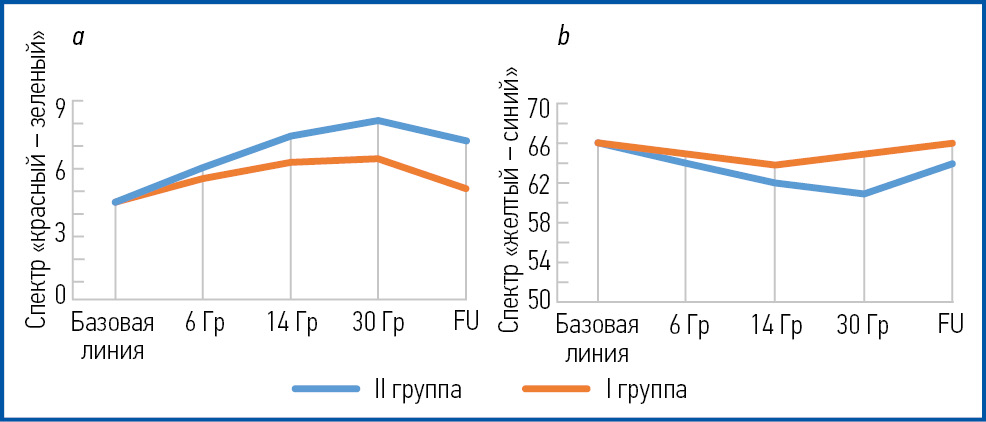 Различия в измерениях содержания меланина в облученной коже между группами не были значимыми на исходном уровне и при достижении СОД 6 Гр (p>0,1). Результаты показали значительную разницу в показателях содержания меланина между группами в следующие интервалы: при достижении СОД 14 и 30 Гр (p<0,001) и через 14 дней после окончания ТОК. Метод хромометрии показал достоверные различия в исследуемых группах в отношении изменений показателей шкал спектров «красный – зеленый» и «желтый – синий», маркирующих более выраженные проявления васкуляризации, эритемы и пигментации в группе контроля на указанных интервальных промежутках (рис. 2).