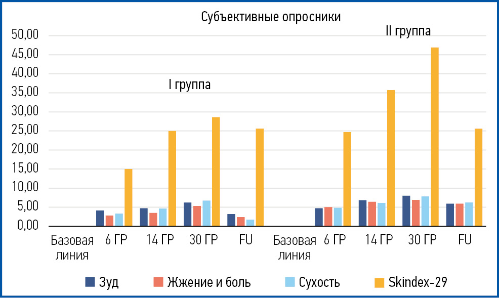 По мере увеличения СОД степень выраженности симптомов (ощущение жжения, зуд, тянущая боль и болезненность), оцениваемых при помощи субъективных шкал, возрастала в течение курса ЛТ, достигала максимума к его окончанию и в течение 1-й недели после окончания облучения, а затем постепенно снижалась. В группах наблюдалось различие среднего максимального показателя снижения КЖ по 29-балльной шкале Skindex-29 (30,5±2,8 – группа I против 46,9±3,7 – группа II; p<0,05). Прогрессирование симптомов боли, зуда и сухости, о которых сообщали пациенты, оценивали по 5-балльной шкале Лайкерта и выявили аналогичную статистически достоверную разницу в траекториях нарастания (рис. 3). В исследуемой группе средние показатели были достоверно ниже в среднем на 22,2%: шкала зуда: 3,9±0,3 и 4,8±0,2; жжение: 2,7±0,2 и 3,7±0,4; боль: 2,3±0,2 и 2,9±0,1 (p<0,05).