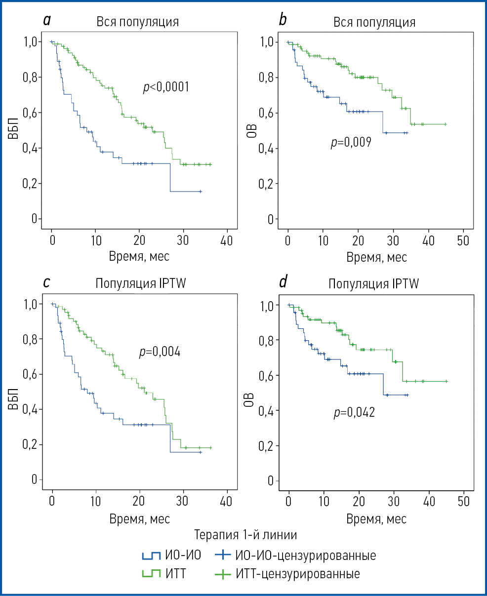 Во всей популяции нами отмечено достоверное преимущество ИТТ по сравнению с ИО-ИО в отношении ЧОО (р=0,032), ЧКО (р=0,002), ВБП (р<0,001) и ОВ (р=0,009). При этом наибольшую клиническую и статистическую значимость выигрыш от ИТТ обеспечивал в когортах пациентов с высоким риском прогрессирования и смерти от ПКР – в группе неблагоприятного прогноза IMDC и при саркоматоидной дифференцировке опухоли. Обратное взвешенное распределение пациентов в группы лечения позволило подтвердить преимущество ИТТ по сравнению с ИО-ИО в сбалансированных когортах больных, реализовавшееся в отношении всех ключевых критериев оценки эффективности, включая ЧОО, ЧКО, ВБП и ОВ. Более того, регрессионный анализ, включавший общепризнанные факторы риска, влиявшие на выживаемость и в нашей серии наблюдений (низкий соматический статус, группа неблагоприятного прогноза IMDC, синхронные метастазы, метастазы в печени и костях), подтвердил независимое влияние режима терапии 1-й линии на прогноз как ВБП, так и ОВ.
