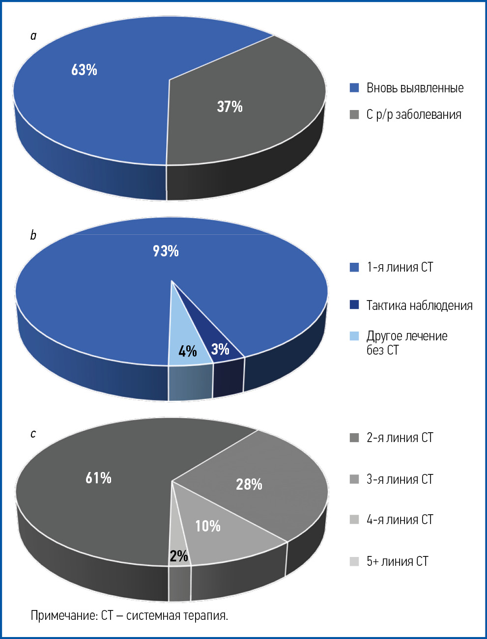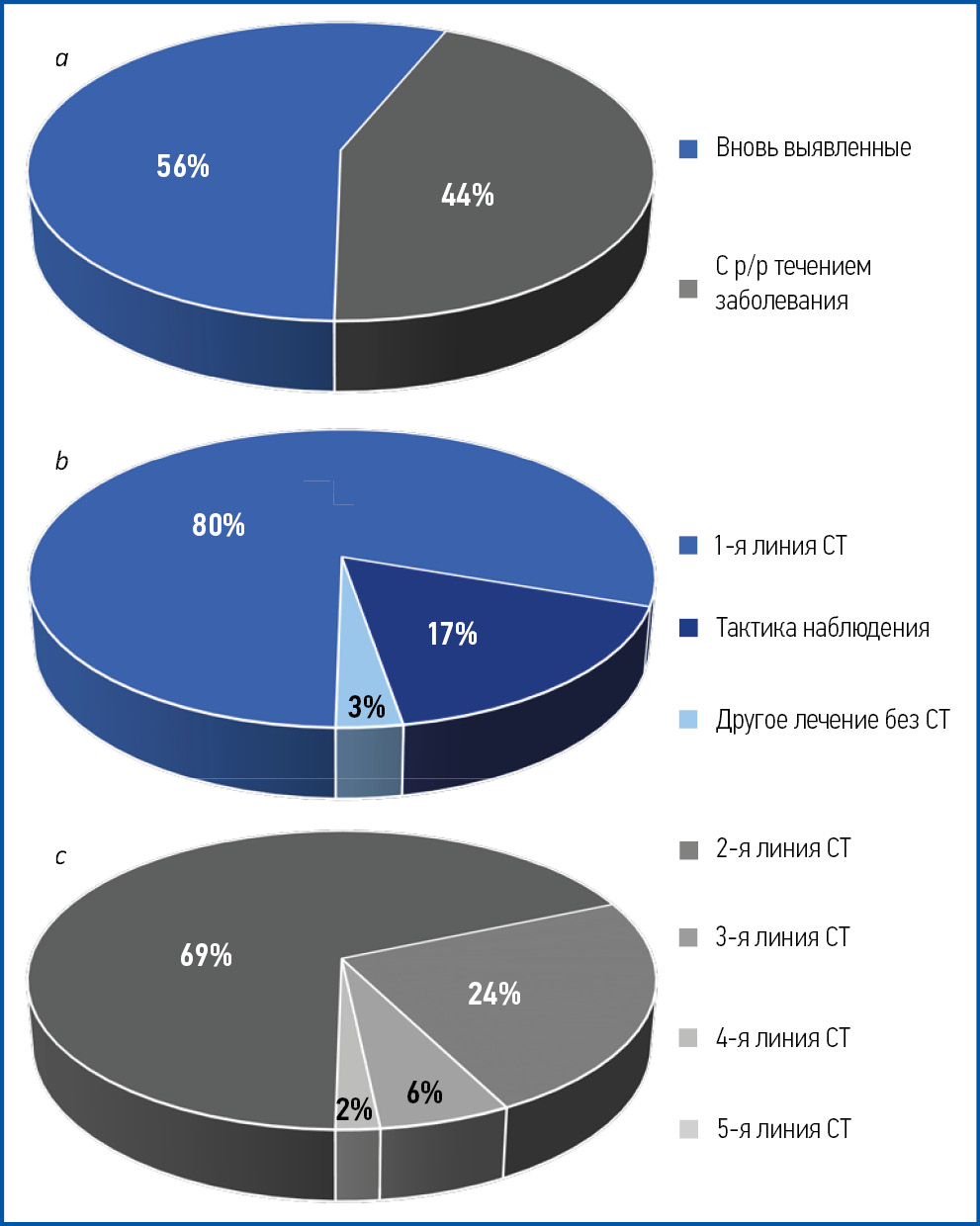 Рис. 1. Структура пациентов с ДВККЛ, %: а – распределение пациентов в зависимости от статуса заболевания на момент проведения опроса; b – распределение вновь выявленных пациентов в зависимости от инициальной тактики ведения; c – распределение пациентов с р/р заболевания в зависимости от ЛТ. Под наблюдением участников опроса за последние 12 мес находились 3158 пациентов с ДВККЛ.
