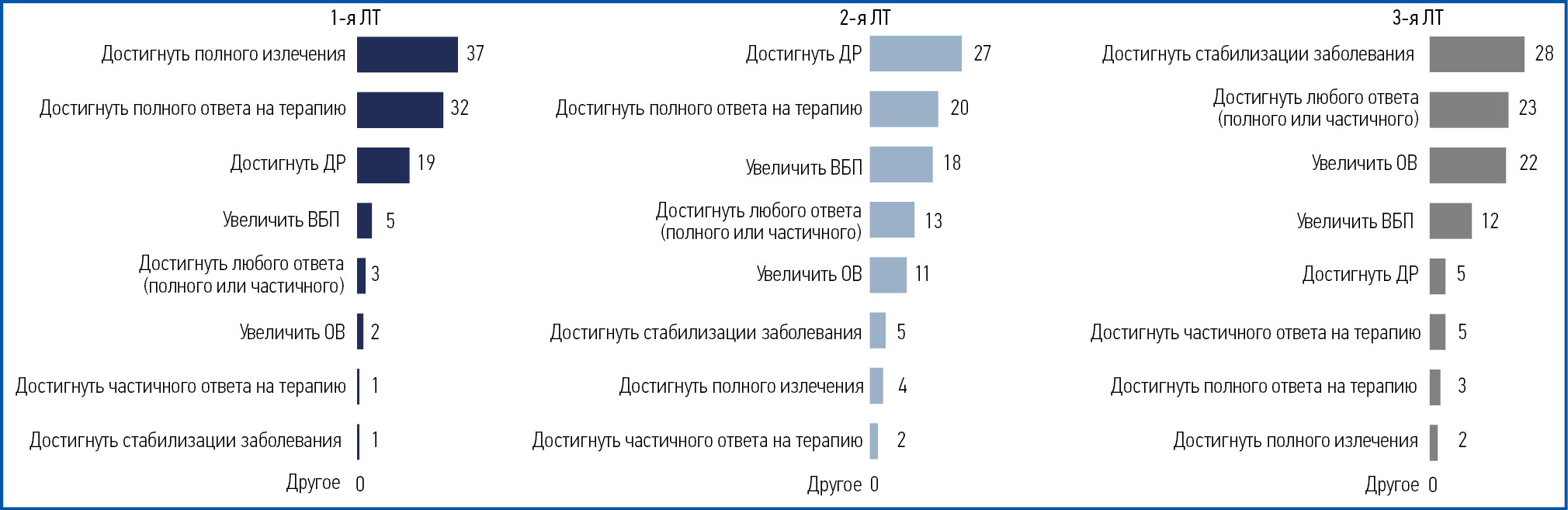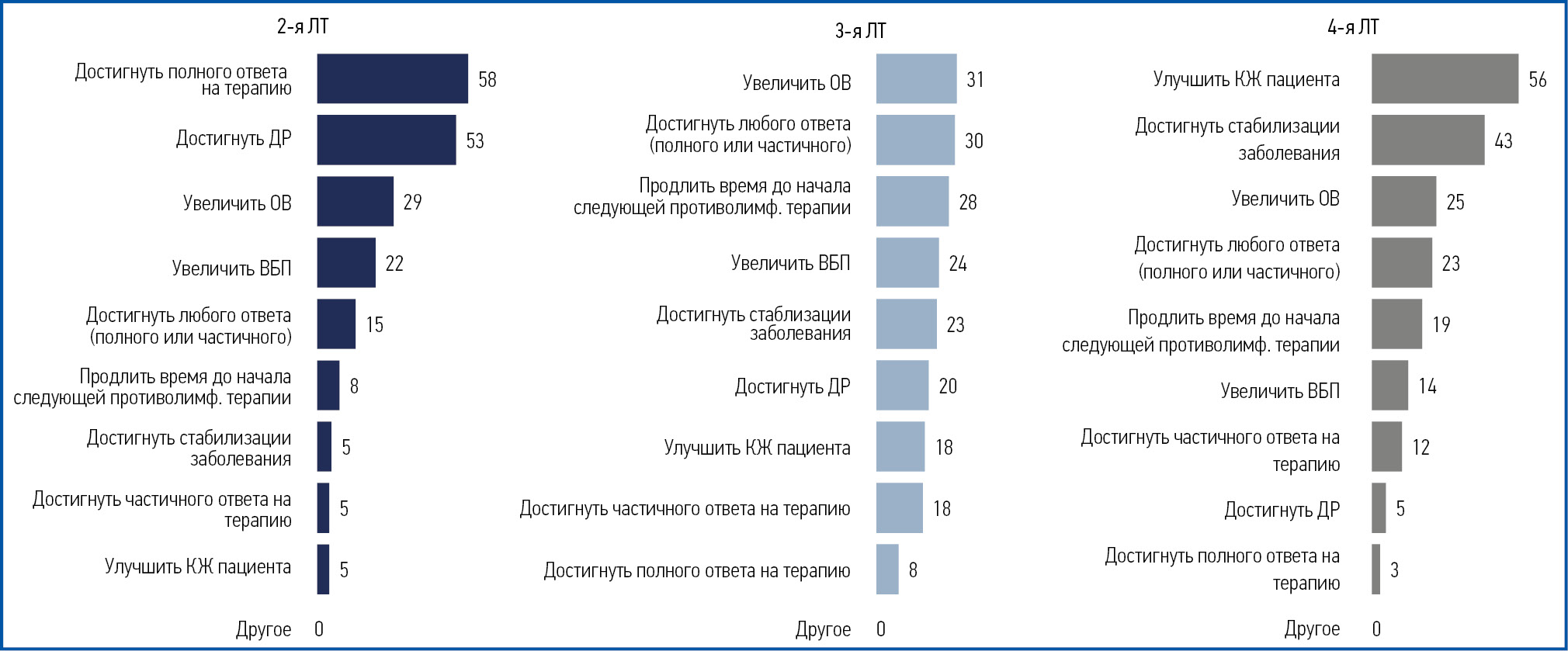 Прежде чем назначить тот или иной вариант лечения, целесообразно определить цели терапии с учетом клинических проявлений заболевания, характеристик и предпочтений пациента. В результате проведенного опроса удалось определить приоритетные цели врачей-респондентов для каждой планируемой линии. Так, при назначении лечения по поводу первого рецидива или прогрессирования большинство (58%) врачей рассчитывают на получение полного ответа, а к 4-й ЛТ качество жизни (КЖ) становится приоритетом для 56% опрошенных гематологов и онкологов. Что же касается 3-й ЛТ, то на этом этапе мнения врачей разделились в равных пропорциях: улучшение ОВ назвали 31%, получение любого ответа в виде полной или частичной ремиссии – 30%, увеличение времени до следующей терапии – 28% (рис. 8).