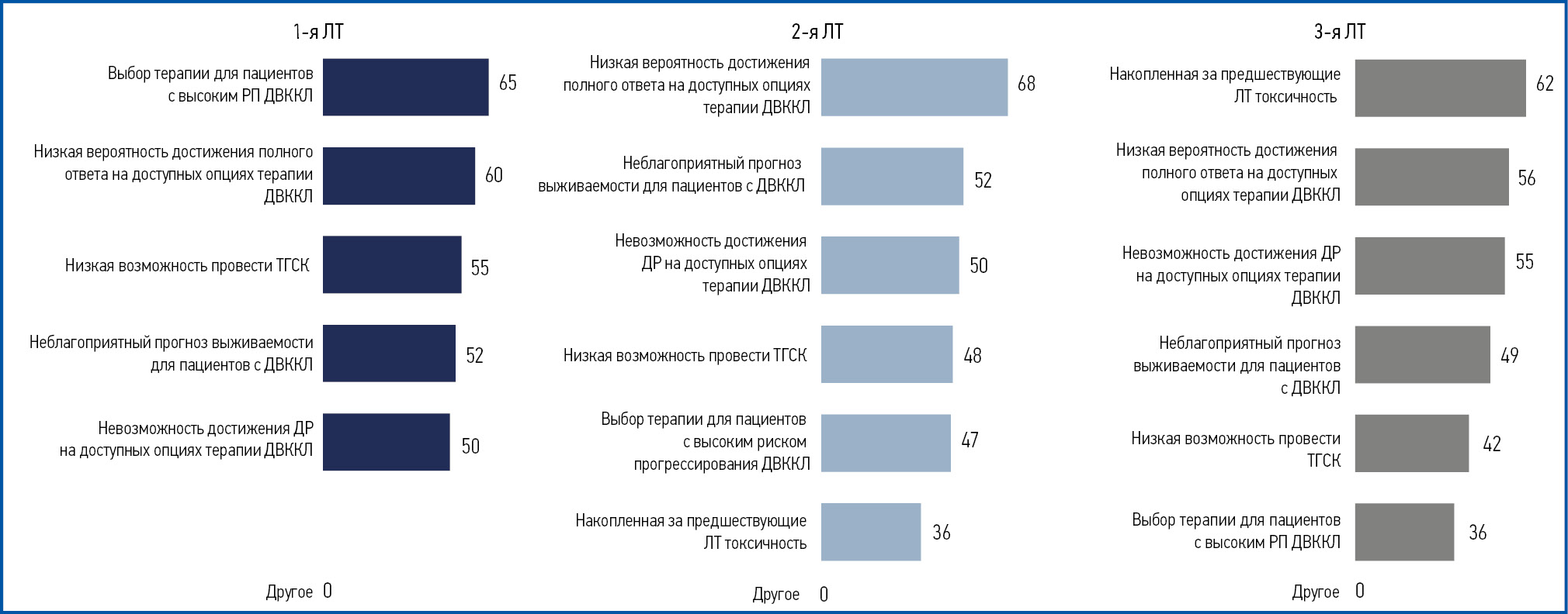 Спектр наибольших сложностей в терапии больных ДВККЛ, по мнению респондентов, зависит от ЛТ. Так, при возможности мультивыбора в 1-й ЛТ 65% врачей наибольшую сложность видят в выборе варианта лечения для пациентов с высоким РП ДВККЛ. Примерно с такой же частотой (60%) респонденты отмечают низкую вероятность достижения полного ответа на доступных опциях. В 55% случаев специалисты считали низкой возможность проведения аутологичной трансплантации гемопоэтических стволовых клеток (аутоТГСК) в случае развития рецидива заболевания. На 2-й ЛТ ситуация некоторым образом меняется: 68% респондентов видят проблему в низком уровне достижения полного ответа, 52% – в неблагоприятном прогнозе выживаемости, 50% врачей отмечают невозможность достижения ДР на доступных методах терапии. Для 3-й ЛТ на первый план выходит накопленная за предшествующие ЛТ токсичность, которую выделили 62% врачей, низкую вероятность достижения полного ответа считают проблемой 56% респондентов, а невозможность достижения ДР – 55% (рис. 3).
