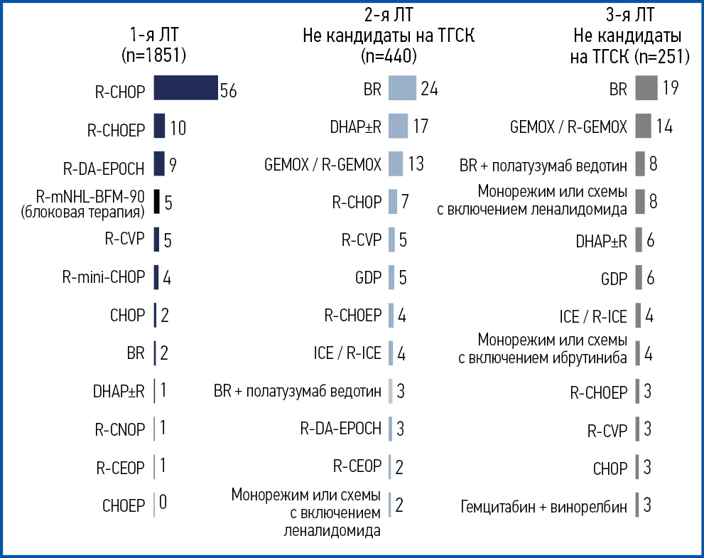 Рис. 11. Распределение схем лечения ФЛ по ЛТ, %. Все пациенты, вошедшие в анализ, получили как минимум 3 ЛТ.
