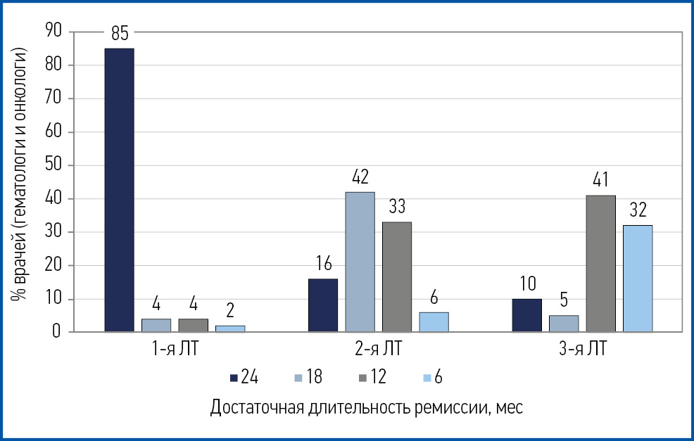 Одним из наиболее важных параметров, определяющих успех лечения, является длительность ремиссии. Подавляющее большинство (85%) опрошенных врачей считают, что по окончании 1-й ЛТ длительность ремиссии должна быть не менее 2 лет. После 2-й ЛТ 42% респондентов воспринимают длительность ремиссии в 1,5 года как достаточную, 41% опрошенных считают, что после 3-й ЛТ ремиссия должна длиться не менее года, а 32% врачей довольствуются 6-месячным периодом без признаков прогрессирования заболевания (рис. 5).