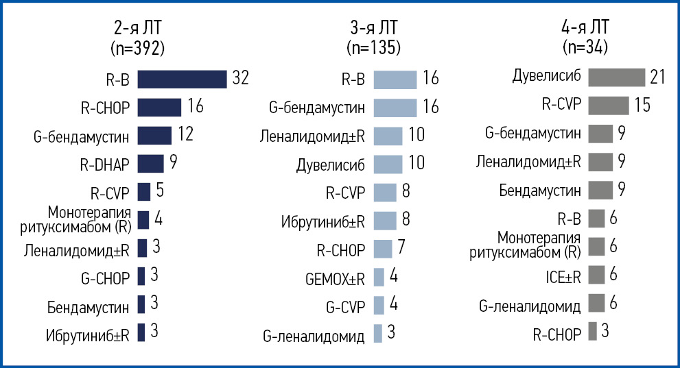 Двойная рефрактерность (к ритуксимабу и алкилирующим препаратам, включая циклофосфамид и бендамустин) к началу 3-й ЛТ констатируется у 1/3 (33%) пациентов, к началу 4-й ЛТ – уже у 1/2 (50%) больных. Данная характеристика косвенным образом говорит об отсутствии реальных эффективных опций для предлеченных пациентов с ФЛ, что подтверждается анализом режимов терапии, применяемых в российской КП (рис. 11).
