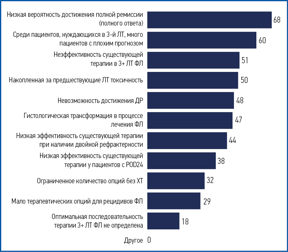 Высокая гетерогенность в выборе тактики для ≥3-й ЛТ ФЛ, а также указанные цели могут быть отчасти связаны с низкой удовлетворенностью эффективностью существующих подходов. Все респонденты отметили наличие трудностей при терапии ФЛ после второго рецидива. При этом среди ключевых проблем респонденты выделили низкую вероятность достижения полного ответа – 68%, большую долю пациентов с плохим прогнозом – 60%, неэффективность существующих опций – 51%, накопленную токсичность – 50% (рис. 9).