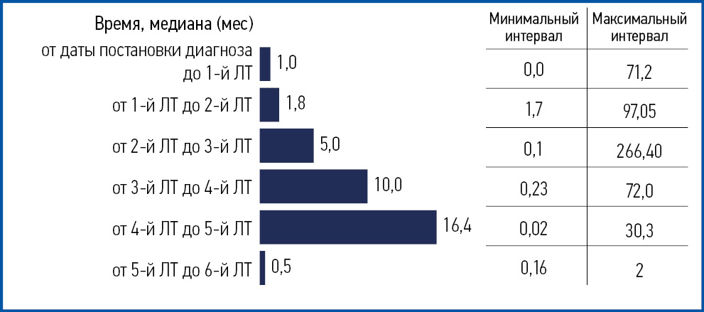 Клиническая характеристика заболевания и самого пациента усугубляется с возрастанием ЛТ. Так, длительность периода между 3 и 4-й ЛТ составляет менее полугода, между 4 и 5-й ЛТ – менее 2 мес (рис. 10). Если к началу 3-й ЛТ ECOG 3–4 имеют 14% пациентов, то к началу 4-й ЛТ данный показатель составляет уже 40%.