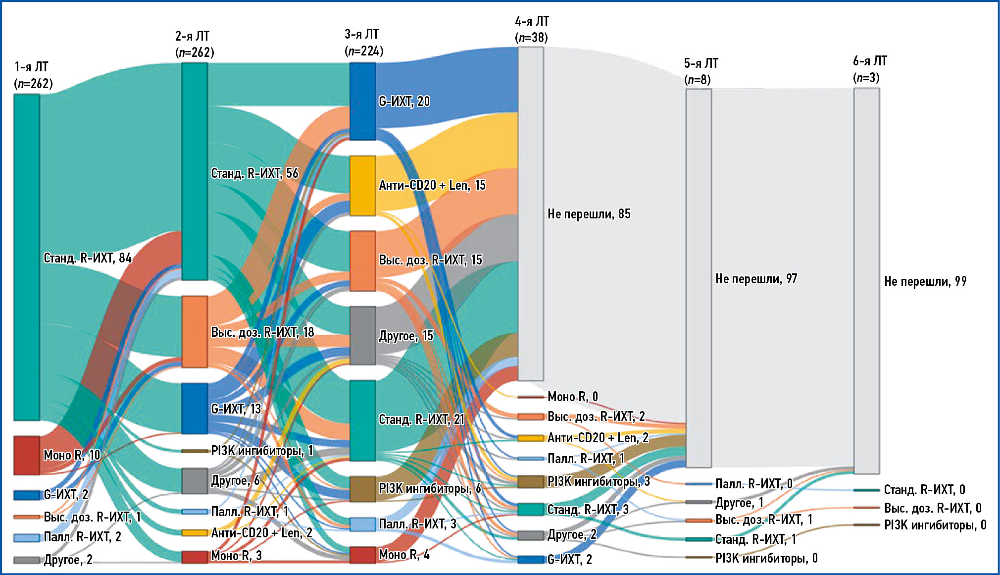Несмотря на то что ИХТ преобладает во всех ЛТ ФЛ, в данном исследовании прослеживается четкий тренд к сокращению частоты применения цитостатиков и увеличению распространенности использования chemo-free режимов с каждой последующей линией, что может говорить как о недостаточной эффективности ИХТ для сильно предлеченных пациентов, так и о невозможности ее применения в силу выраженной накопленной токсичности. Высокая степень вариативности в выборе терапии рецидивов, особенно начиная с 3-й ЛТ, говорит об отсутствии стандарта лечения данной категории пациентов.