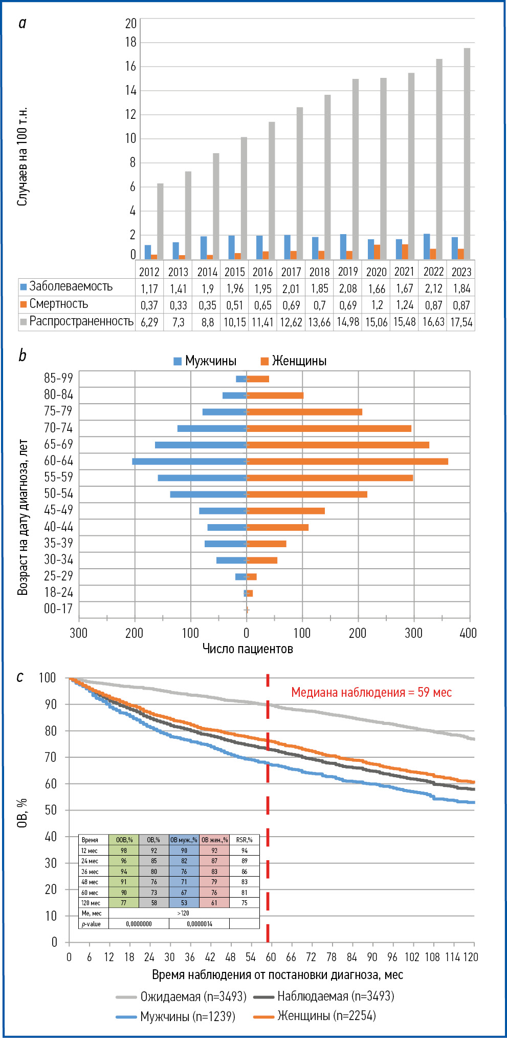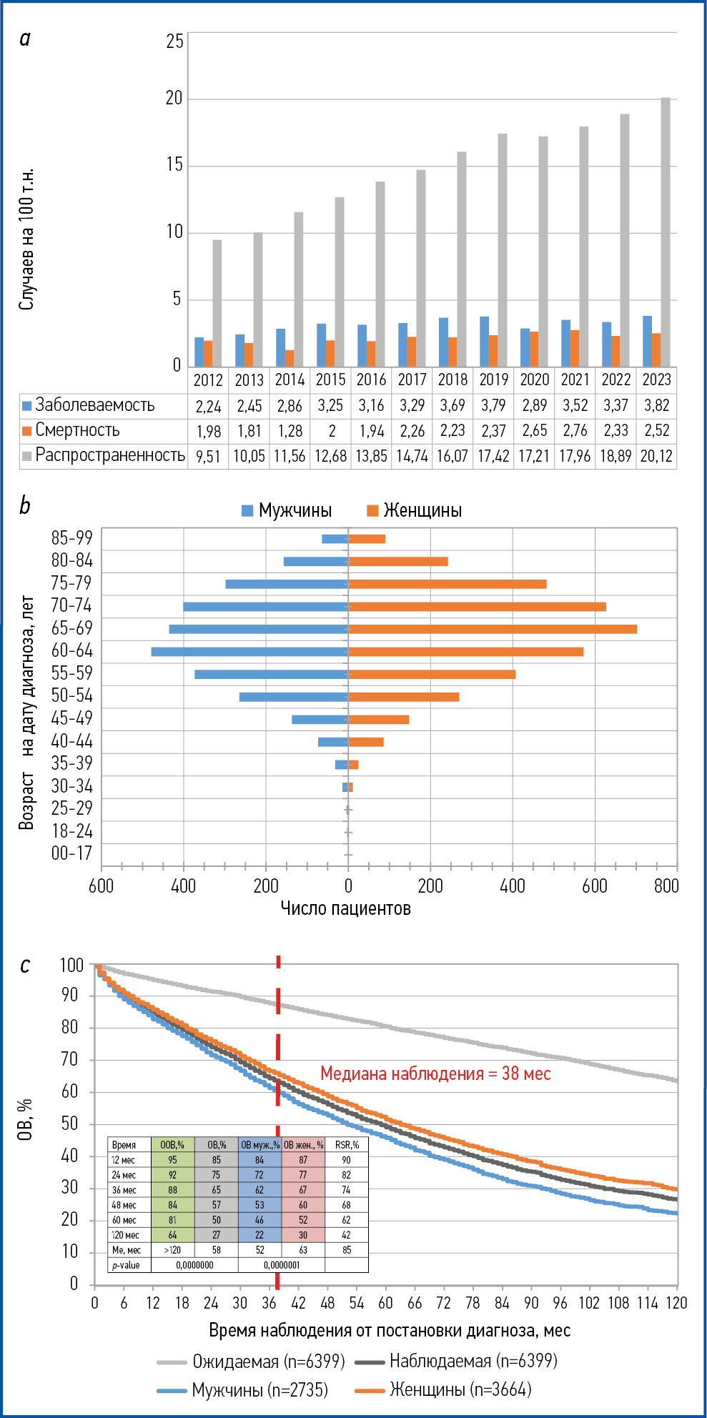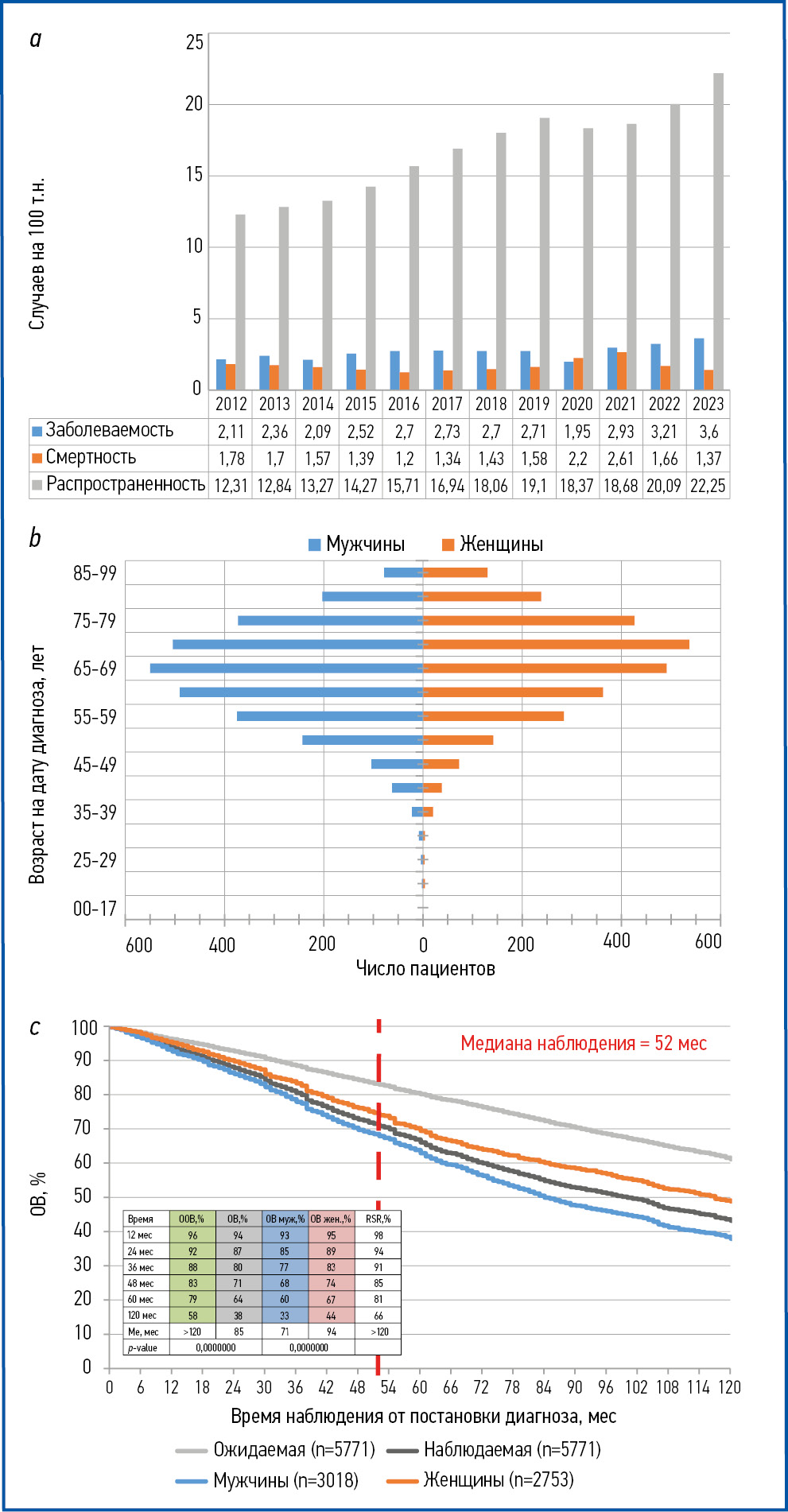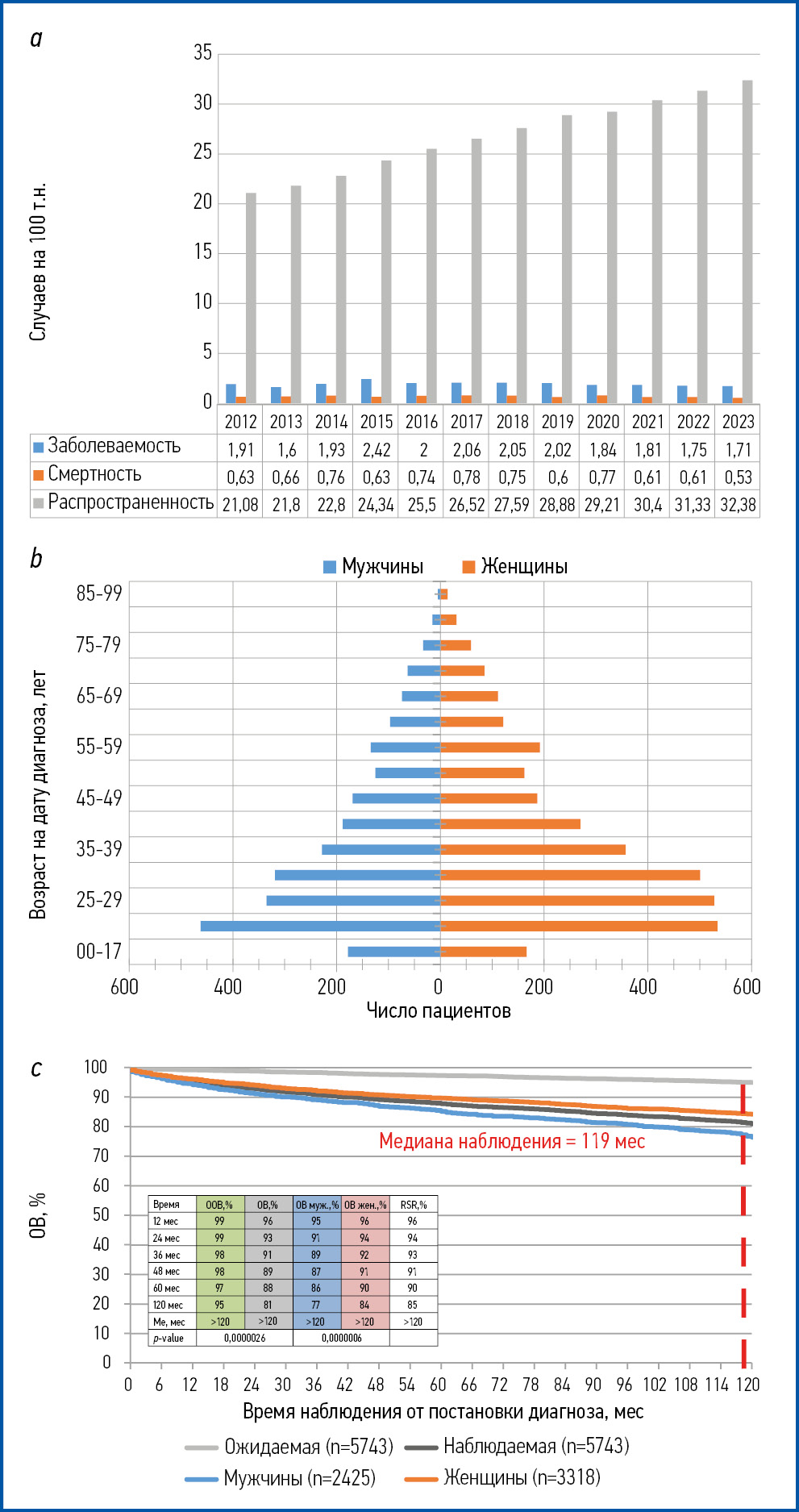Рис. 6. Эпидемиологические показатели ЛХ: а – динамика регистрируемых распространенности, заболеваемости, смертности в регионе в 2012–2023 гг.; b – гендерно-возрастная характеристика пациентов; c – показатели ОВ больных ЛХ в общей и гендерных группах и временной ожидаемой выживаемости.