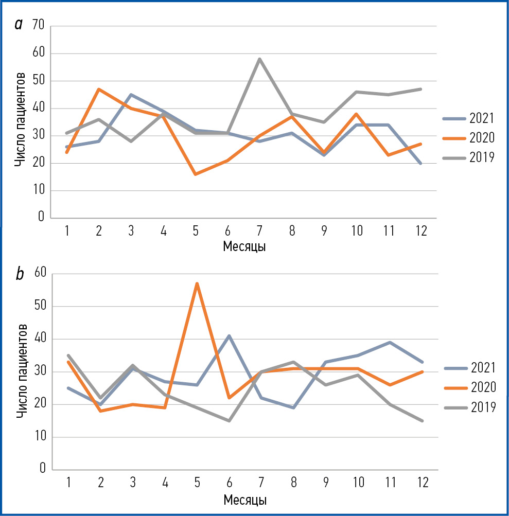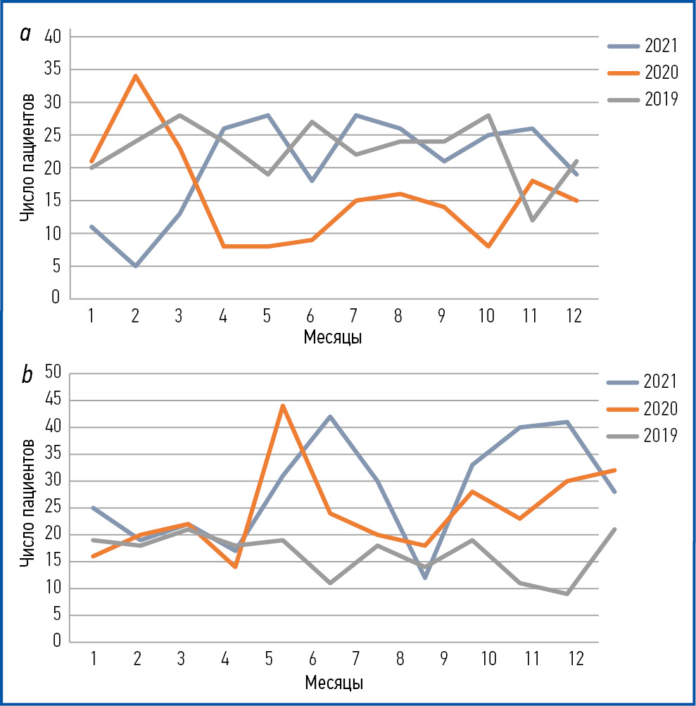 Количество новых случаев ММ в 2020 г. (n=364) по сравнению с 2019 г. (n=476) снизилось на 23%. Максимальный пик их регистрации в 2020 г. пришелся на начало года, когда еще не началась пандемия, минимальное количество зарегистрированных случаев – на весенний период, начало пандемии (рис. 2, а). Общее количество регистрируемых летальных случаев в 2021 г. (n=372) оставалось на уровне первого года пандемии, однако большая часть случаев зарегистрирована во второй половине года. Обращает на себя внимание факт, обнаруженный в процессе исследования, что в период пандемии частота регистрации более тяжелых случаев ММ (III стадия по классификации Дьюри–Салмон) возросла на 4% по сравнению с 2019 г. (75 и 71% соответственно).