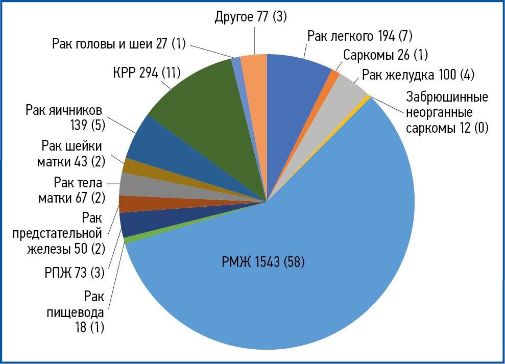 С февраля 2021 по декабрь 2022 г. в исследование включены 3218 пациентов, из которых 3217 получили хотя бы одну дозу эмпэгфилграстима. Характеристики пациентов представлены в табл. 2. Медиана возраста составила 59 лет. Большинство пациентов – 2276 (70,7%) – были моложе 65 лет, заболевание II–III стадии было диагностировано в 2244 (69,8%) случаях. Терапию по поводу распространенного заболевания получали 1296 (40,3%) больных. Подавляющее большинство составили пациенты с диагнозом РМЖ – 1758 (54,6%). Также ведущими локализациями в структуре являлись колоректальный рак (КРР) – 327 (10,2%), рак легкого – 238 (7,4%), рак яичников – 216 (6,7%).