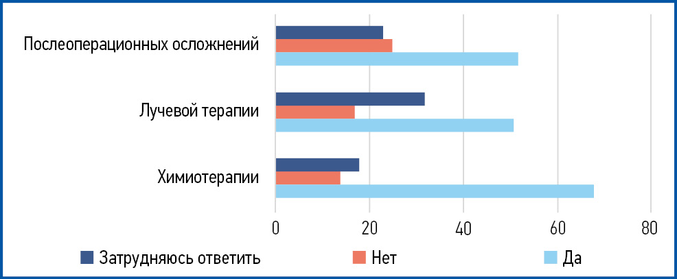 Интересным представляется оценка мнения врачей о частоте развития осложнений при различных видах онкологического лечения – подавляющее большинство врачей убеждены, что у ВИЧ-инфицированных больных выше вероятность развития осложнений по сравнению с общей популяцией (рис. 2).