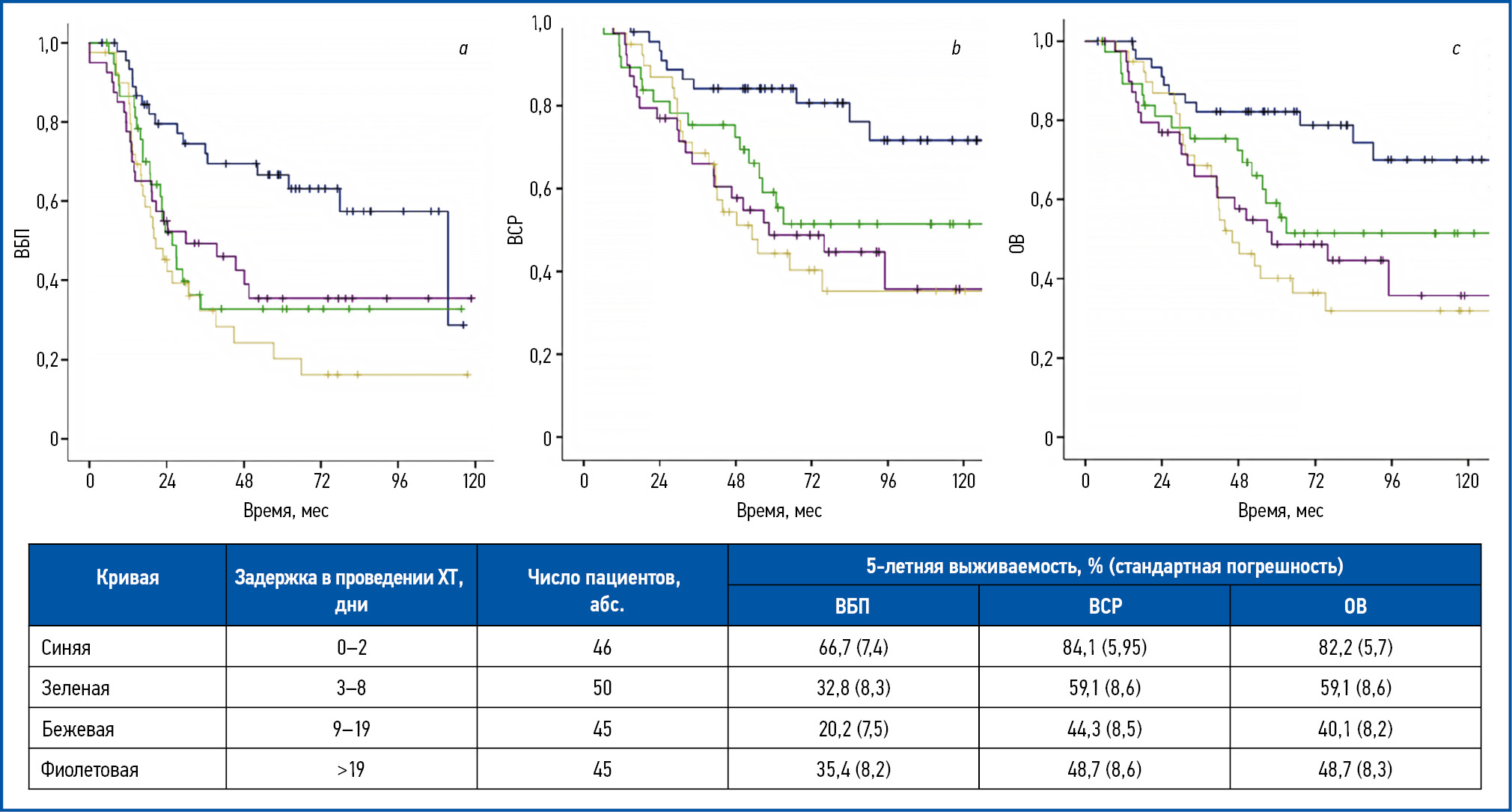Рис. 1. Кривые выживаемости Каплана–Мейера для пациентов, разделенных на группы риска в соответствии с увеличением продолжительности курса ХТ, приведены: a – для ВБП; b – ВСР; c – ОВ.
