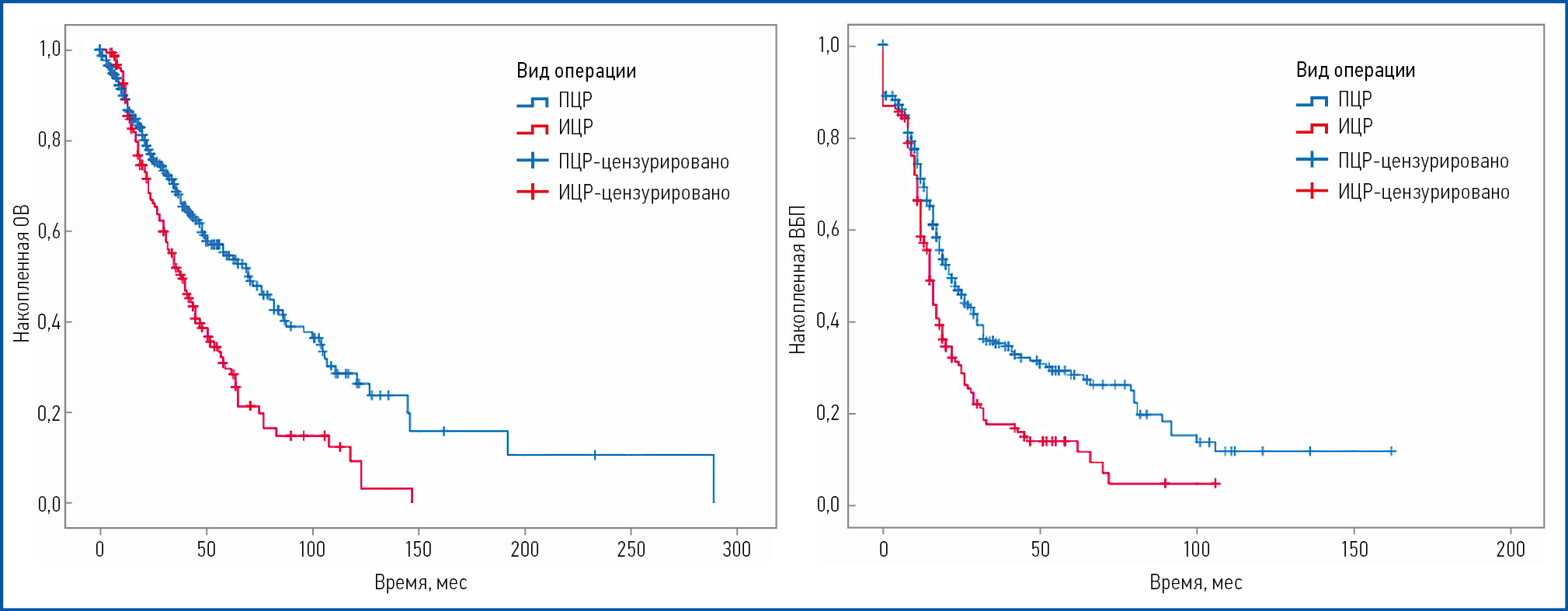 В группе больных с ПЦР отмечались преимущества в отношении ОВ: медиана ПЖ составила 70,0 ± 8,0 мес, 5-летняя ОВ – 54,5 ± 3,6%, у больных, которым выполнена ИЦР, медиана ПЖ составила 39,0 ± 4,0 мес, 5-летняя ОВ – 29,6 ± 4,4% (p < 0,001, ОР 1,8, 95% ДИ 1,4–2,3); табл. 1, 2, рис. 1.