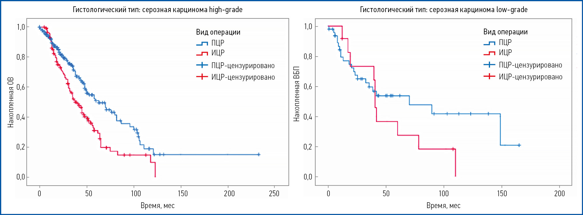 В наших исследованиях у больных раком яичников IIIC–IVВ стадий наблюдалась более высокая эффективность ПЦР по сравнению с ИЦР. У больных после ПЦР медиана ПЖ выше на 31,0 мес, 5-летняя ОВ – на 24,9% (p < 0,001) и медиана ВБП – на 7,0 мес, 5-летняя ВБП – на 14,4% (p < 0,001). При этом у больных с ПЦР в неоптимальном объеме достоверно ниже медиана ПЖ на 12,0 мес, чем у больных после НАХТ в полном или оптимальном объеме (p = 0,037). У больных раком яичников IIIC–IVB стадий, которым выполнена ПЦР в полном и оптимальном объеме, рецидив случался на 5,0 мес позже, чем после ИЦР в полном или оптимальном объеме (p < 0,001). Проведение НАХТ больным серозной карциномой яичников low-grade IIIC–IVB стадий достоверно ухудшает медиану ПЖ на 29,0 мес (p = 0,008) и медиану ВБП на 5,0 мес (p = 0,040) [10, 15].