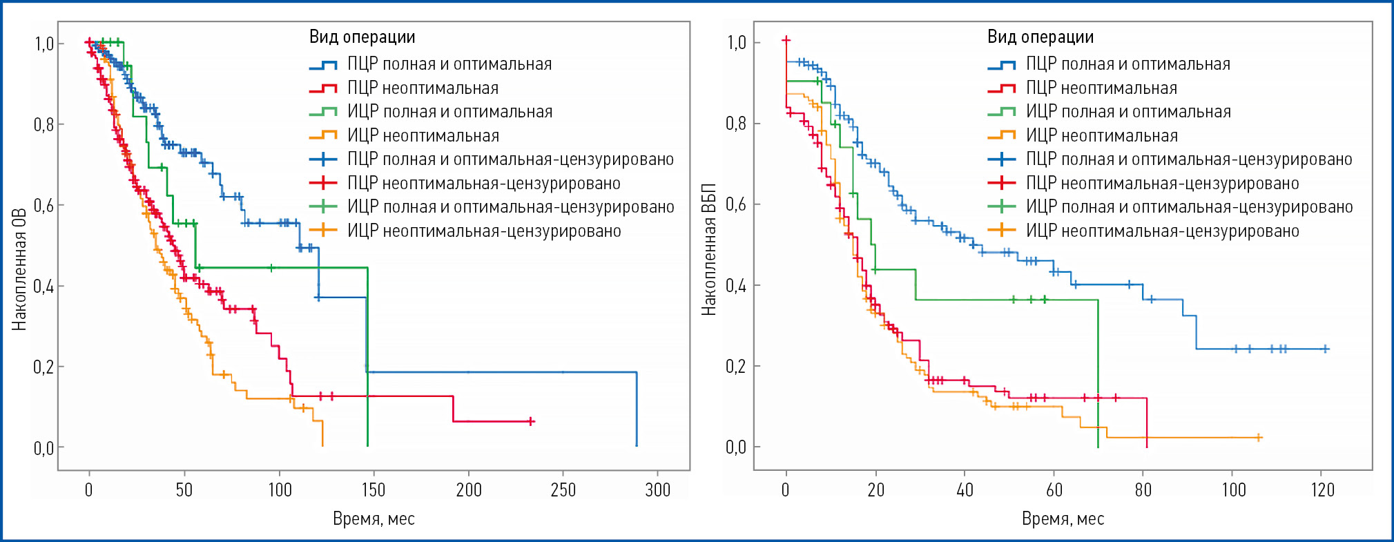 В международных исследованиях EORTC, CHORUS и по данным ФГБУ «НМИЦ онкологии им. Н.Н. Блохина», на долю первичных оптимальных циторедукций пришлось 38,2, 43,1 и 20,4% и интервальных оптимальных – 81,0, 67,7 и 66,7% операций соответственно [2, 10, 11]. В наших исследованиях низкий процент полных и оптимальных ИЦР, вероятно, обусловлен тем, что в течение долгого времени врачи нашего региона воспринимали ИЦР как операцию, направленную на удаление первичного очага, ограничиваясь зачастую лапаротомией, экстирпацией матки с придатками, оменэктомией. В последние годы данный подход изменился, при этом максимальные преимущества в ОВ и ВБП имелись у больных с полной и оптимальной ПЦР (медиана ПЖ – 82,0 ± 18,5 мес, 5-летняя ОВ – 70,1 ± 5,5%; медиана ВБП – 24,0 ± 2,0 мес, 5-летняя ВБП – 43,2 ± 5,9%) по сравнению с больными, которым выполнена неоптимальная ПЦР (медиана ПЖ – 44,0 ± 4,8 мес, 5-летняя ОВ – 40,1 ± 5,0%; медиана ВБП – 16,0 ± 1,3 мес, 5-летняя ВБП – 12,3 ± 3,3%; p < 0,001; ОР 2,5, 95% ДИ 1,7–3,8 для ОВ; p < 0,001; ОР 2,7, 95% ДИ 2,0–3,7 для ВБП) и ИЦР в неоптимальном объеме (медиана ПЖ – 35,0 ± 3,4 мес, 5-летняя ОВ – 27,2 ± 4,7%; медиана ВБП – 15,0 ± 1,3 мес, 5-летняя ВБП – 10,2 ± 3,1%; p < 0,001; ОР 3,3, 95% ДИ 2,2–5,0 для ОВ; p < 0,001; ОР 2,8, 95% ДИ 2,0–3,9 для ВБП).