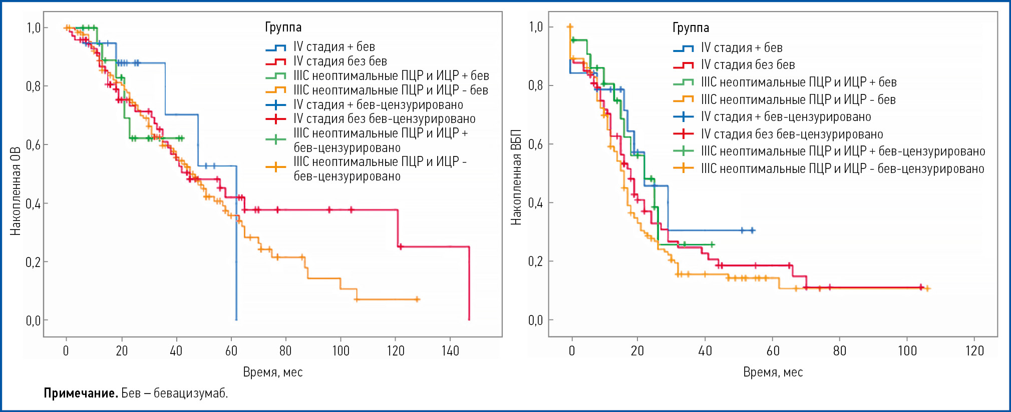 ОВ пациенток, которым выполнена ПЦР в полном или оптимальном объеме, оказалась достоверно выше, чем у больных с ИЦР в полном или оптимальном объеме. У пациенток с ПЦР отмечены преимущества в ВБП по сравнению с пациентками с ИЦР. Также статистически значимо различались между собой по ВБП группы больных, которым выполнена ПЦР в полном или оптимальном объеме, и группы больных с ПЦР в неоптимальном объеме. У больных группы высокого риска прогрессирования не отмечено достоверных преимуществ от добавления бевацизумаба.