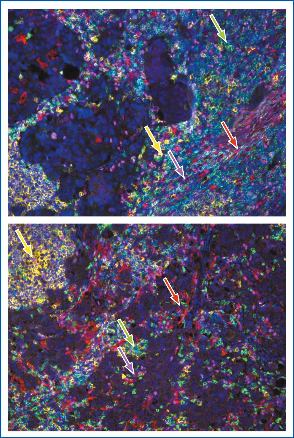Fig. 1. CD8+ cytotoxic lymphocytes (green arrow), CD20+ B lymphocytes (yellow arrow), CD163+ macrophages (red arrow) and FoxP3+ regulatory T (Treg) lymphocytes (pink arrow) in breast cancer tissue. TSA-associated multiplex immunofluorescence, ×100.