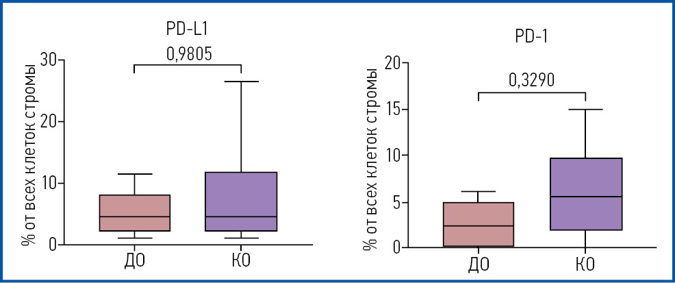 Поскольку точкой приложения иммунотерапии является ось PD-L1/PD-1, в исследовании определена доля клеток опухолевого микроокружения, которые экспрессируют белки PD-L1 и PD-1, и сравнена в группах пациентов с ДО и КО на терапию атезолизумабом в комбинации с наб-паклитакселом. Различий в доле иммунных клеток стромы, экспрессирующих PD-L1 и PD-1, в зависимости от эффекта химиоиммунотерапии (ХИТ) не обнаружено. PD-L1: ДО против КО – 4,46 (2,28–8,12)% и 4,61 (2,37–11,73)%; p=0,9805; PD-1: ДО против КО – 2,33 (0,07–4,85)% и 5,48 (2,12–9,80)%; p=0,3290 (рис. 2).