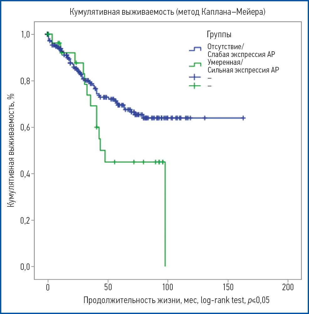 Мы можем видеть на рис. 1, что показатели общей выживаемости оказались выше в группе пациенток с отсутствием/слабой экспрессией АР, в то время как пациентки с умеренной/сильной экспрессией демонстрировали худшие показатели выживаемости.