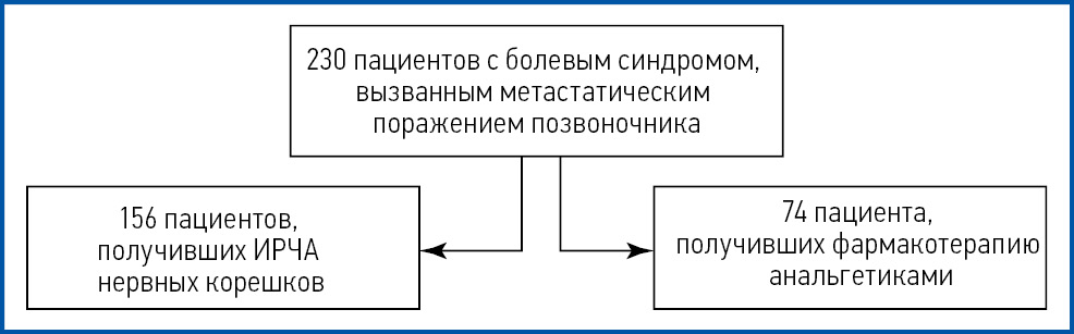 В клинической проспективной работе проводился анализ данных 230 пациентов с болевым синдромом, связанным с метастатическим поражением позвоночника. Все они получали лечение в ФГБУ «НМИЦ онкологии им. Н.Н. Блохина» в 2020–2023 гг. на базе отделения опухолей костей и мягких тканей №1 (вертебральной онкологии). Участников распределили на 2 группы в зависимости от вида противоболевой терапии (рис. 1).