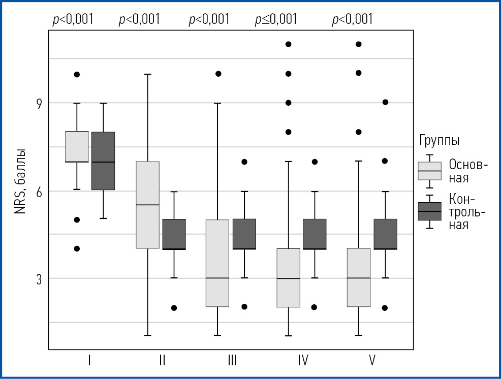 Выраженный болевой синдром (NRS 7–10) составляет 70,4% в основной группе, а в контрольной – 51,0%.