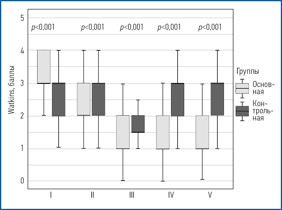 Шкала Watkins, абс. (%) | 1 балл | 3 (1,30) | 0 (0,00) | 3 (4,05) | 0,002 |