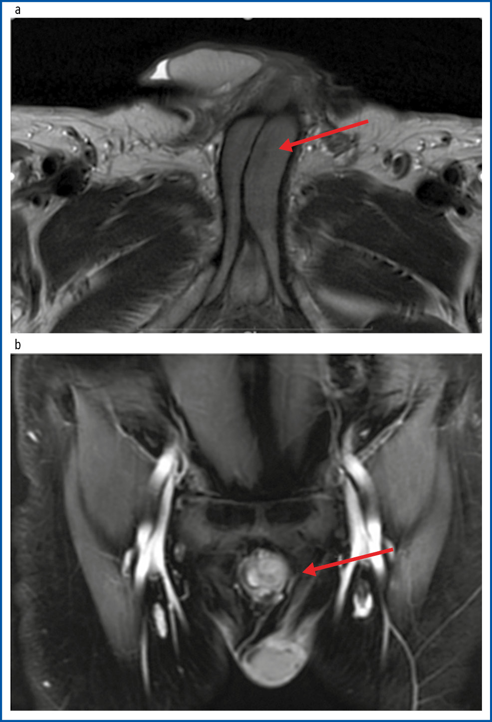 Fig. 1. Patient F., 59 years old: a – T2 MRI view, a hypodense zone at the root of the penis in the cavernous body on the left with the transition to the right; b – coronal post-contrast MRI view; a 50×25 mm mass at the base of the penis on the left with heterogeneous contrast agent uptake.