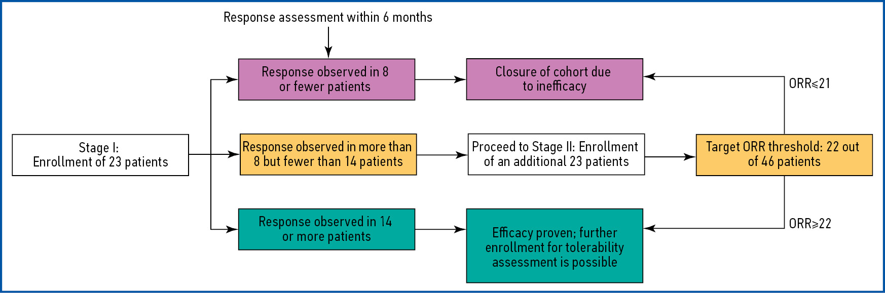 H0: p≤P0 (therapy is insufficiently effective) versus HA: p>P1 (therapy is acceptably effective and warrants further investigation)
