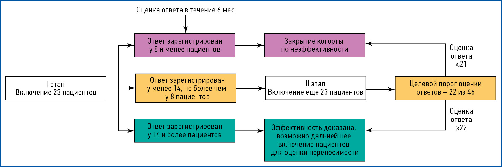 Within the scope of the current non-interventional study, the therapy efficacy was preliminary assessed using the Fleming sequential design for a single-group study with two stages (g1 and g2) to test dichotomous endpoints (p) [10].