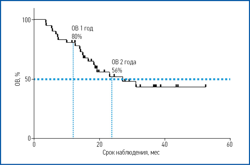 Медиана ОВ у исследуемых пациентов составила 27,3 мес, одногодичная ОВ – 80%, двухгодичная ОВ – 56% (рис. 2).