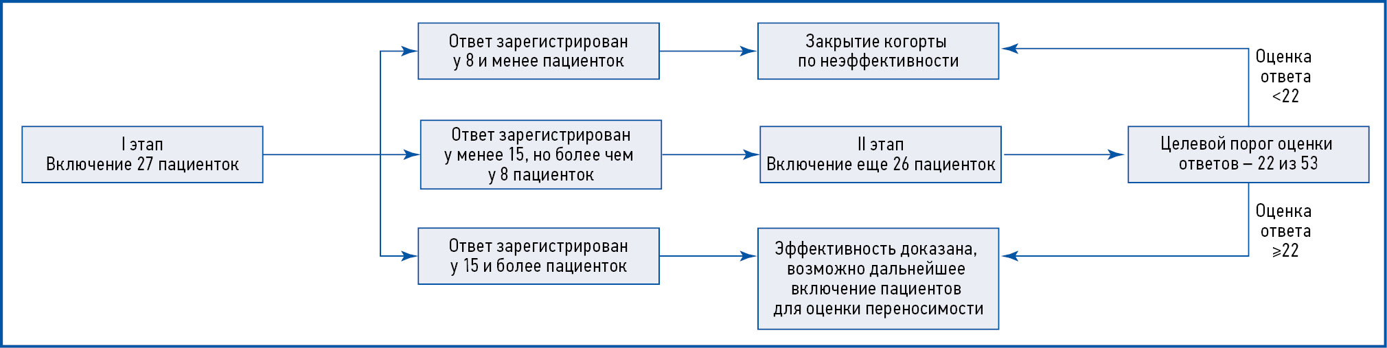 На основании полученных значений определен размер выборки для проведения предварительной оценки эффективности по методу Флеминга. На стадии g1 включены 27 пациенток. Предварительная оценка эффективности может быть завершена после первой части (g1) при условии демонстрации приемлемой эффективности, если R ≥ Rg, т.е. для доказательства эффективности у 15 и более пациенток. При этом для закрытия когорты по недостаточной эффективности ответ должен быть зарегистрирован у 8 и менее пациенток (R ≤ Ag). Если предварительная оценка после первой части не завершена, то проводится повторная предварительная оценка эффективности после второй части (g2), и по ее результатам может быть продемонстрирована приемлемая эффективность, если наблюдаемое кумулятивное число успехов R ≤ Rg. На стадии g2 анализа целевым порогом для доказательства эффективности будет определение объективного ответа не менее чем у 22 из 53 пациенток. Фактическая мощность составит 0,91, фактическая вероятность ошибки I рода – 0,049 (рис. 1).