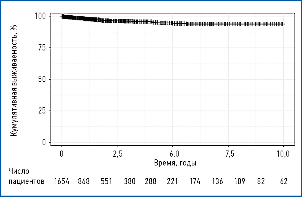 В начале исследования под наблюдением находились 1654 пациента, для которых была известна дата начала терапии. На первом году зафиксирован 21 летальный исход и 1-летняя ОВ составила 98,25%. Пятилетняя ОВ достигала 94,80%, а 10-летняя – 93,88% (рис. 1).