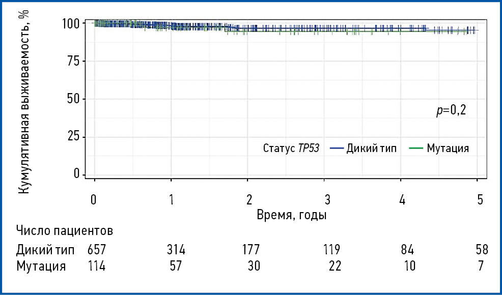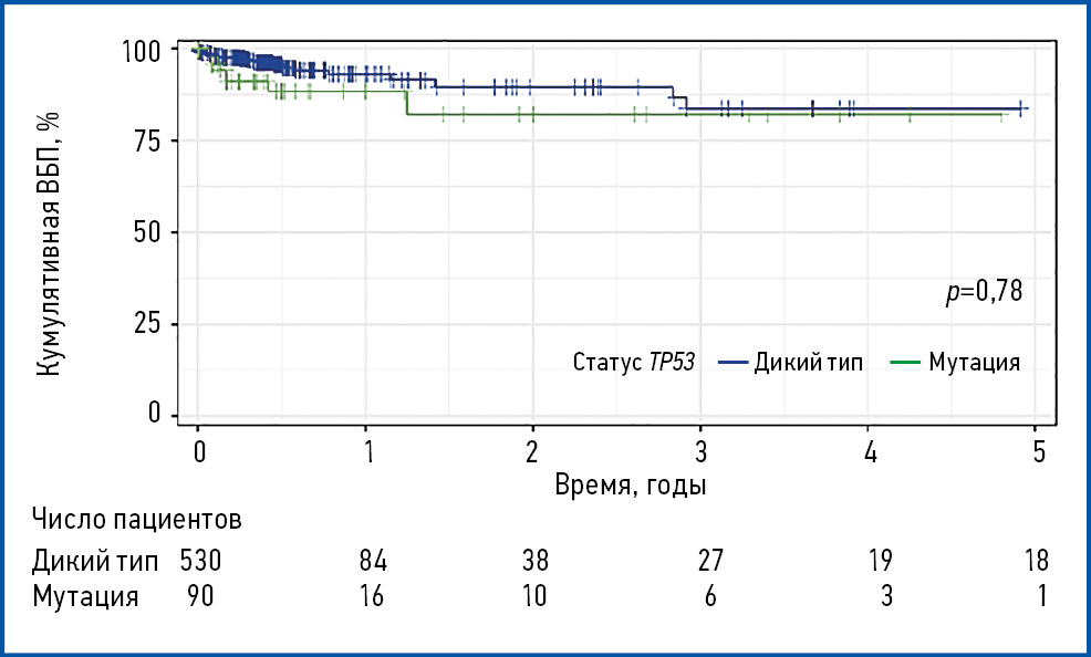 У пациентов с диким типом TP53 отмечалась более высокая ВБП через 1 и 2 года наблюдения (93,23 и 89,61% соответственно), однако к 5-му году ВБП составляла 83,73% и незначительно отличалась от показателей в группе с мутацией ТР53.