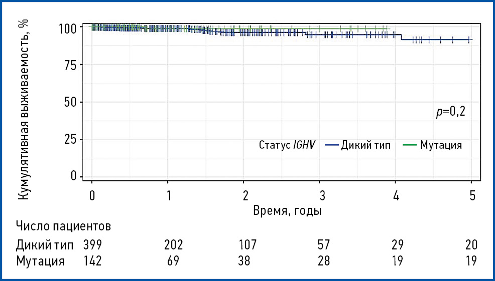 На этапе промежуточного анализа не обнаружено статистически значимых различий в 5-летней ВБП у пациентов с мутацией IGHV, получавших терапию 1-й линии (76,75%), в сравнении с диким типом (89,62%); p = 0,6.