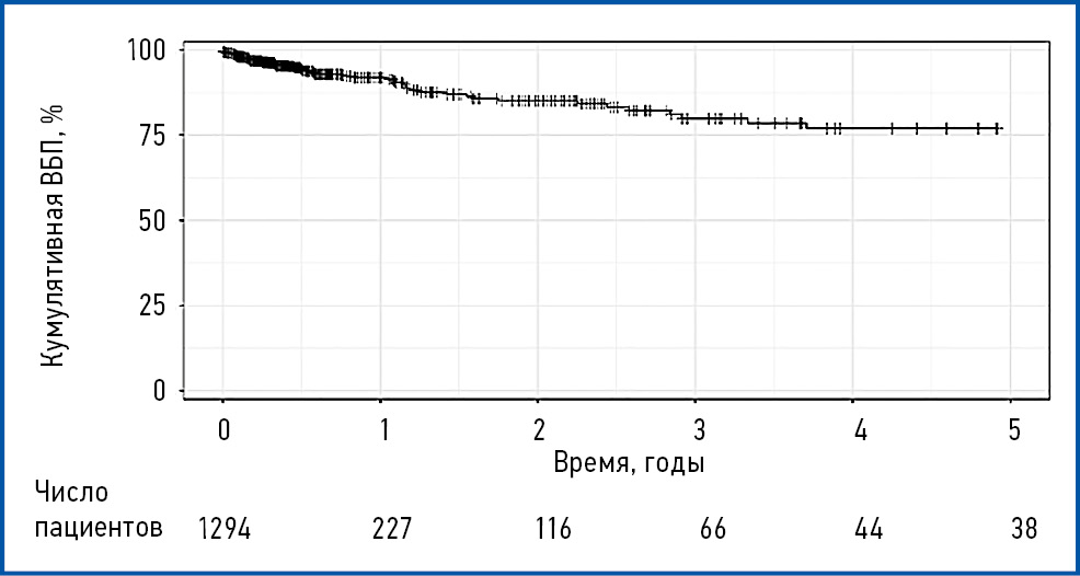 К концу первого года лечения у пациентов, получавших 1-ю линию терапии, ВБП составила 91,86%, а к 5-му году – 76,93%. Совокупный риск прогрессирования увеличился с 8,48% на 1 год лечения до 26,12% – через 5 лет. Таким образом, риск развития прогрессии неуклонно возрастал с течением времени (рис. 4).