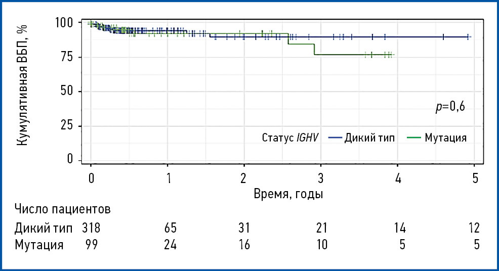 У пациентов с мутацией IGHV, получавших терапию 1-й линии (99 пациентов на момент начала исследования) 1-летняя ВБП составляла 92,10%, 5-летняя – 76,75%. У лиц с диким типом IGHV (n = 318 на момент начала исследования) 1-летняя ВБП составляла 94,16%, 5-летняя ВБП достигала 89,62%; p = 0,6 (рис. 6).