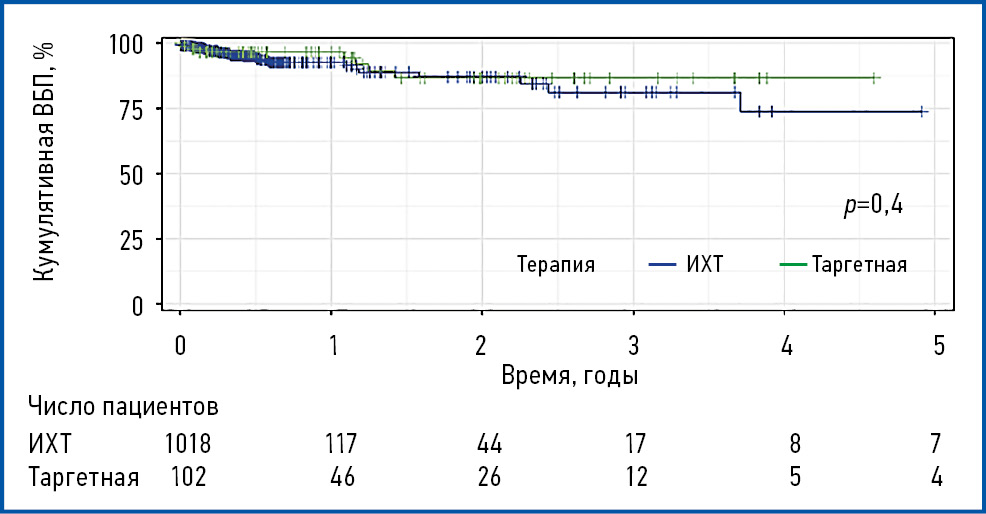 В группе пациентов, получавших 1-ю линию терапии ИХТ-препаратами, к 5-му году наблюдения ВБП снижалась до 73,85% в сравнении с ВБП 86,84% в группе лечения таргетными препаратами (р = 0,4).