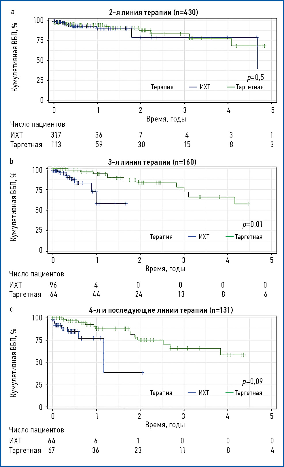 Поскольку каждая последующая линия, как правило, назначается пациентам с более агрессивным течением заболевания или неблагоприятным прогностическим профилем, ВБП оценивалась отдельно в зависимости от вида (таргетная и ИХТ) для каждой последующей линии терапии.