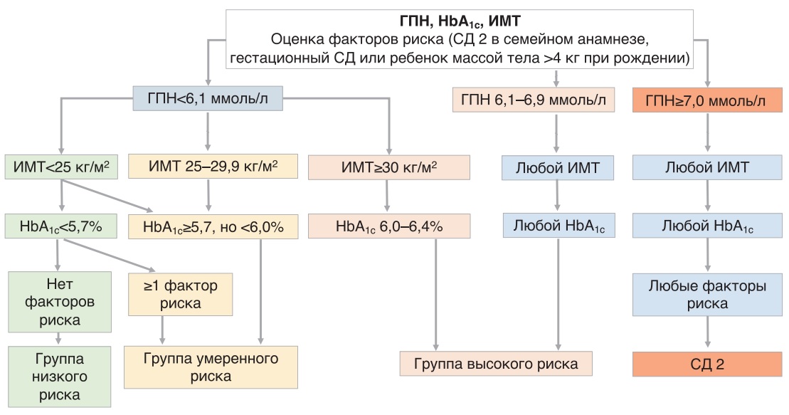 Умеренный риск | Метформин 500–1000 мг на ночь | ГПН 2 раза в неделю | ГПН 1 раз в неделю |